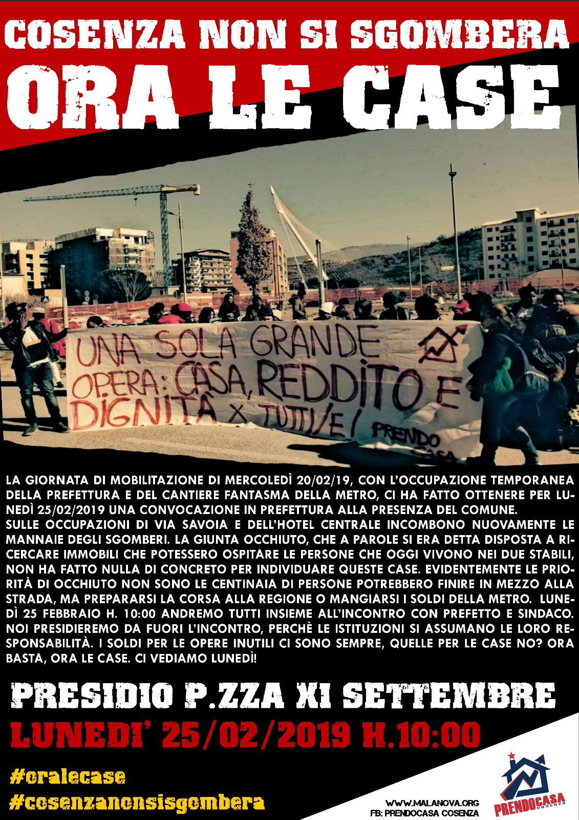 Sulle occupazioni di Via Savoia e dell’Hotel Centrale incombono nuovamente le mannaie degli sgomberi. La giunta Occhiuto, che a parole si era detta disposta a ricercare immobili che potessero ospitare le persone che oggi vivono nei due stabili, non ha fatto nulla di concreto per individuare queste case. Evidentemente le priorità di Occhiuto non sono le centinaia di persone potrebbero finire in mezzo alla strada, ma prepararsi la corsa alla regione o mangiarsi i soldi della metro. Lunedì 25 febbraio h. 10:00 andremo tutti insieme all’incontro con Prefetto e Sindaco. Noi Presidieremo da fuori l’incontro, perchè le istituzioni si assumano le loro responsabilità. I soldi per le opere inutili ci sono sempre, quelle per le case no? Ora basta, ora le case. Ci vediamo lunedì!